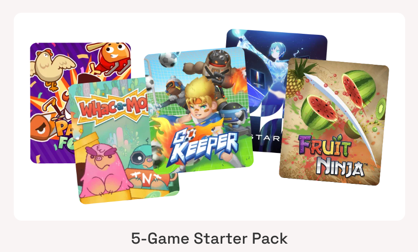 Each Nex Playground comes with a Starter Pack of 5 games included: Fruit Ninja, Whack-a-Mole Deluxe, Party Fowl, Go Keeper and Starri.